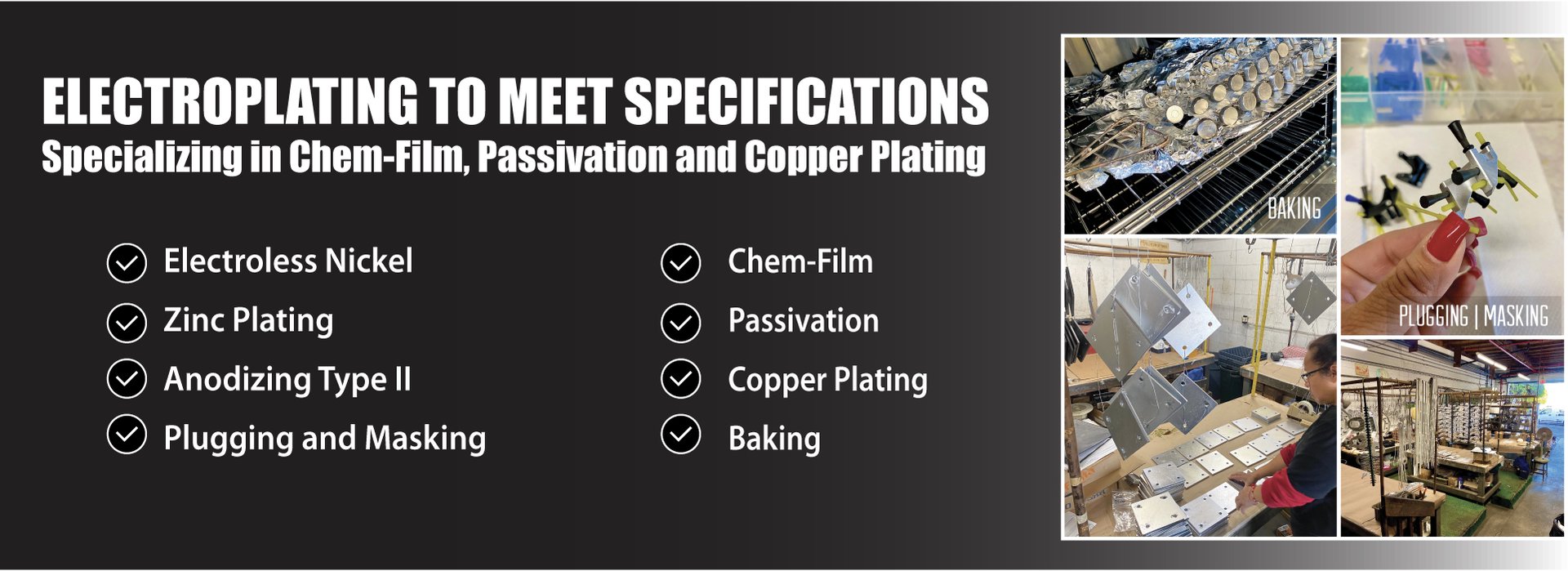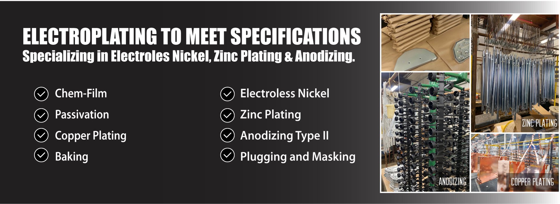Offering In-house Electroless Nickel, Zinc Plating, Anodizing, Chem Film, Passivation, Bright Nickel, Semi-Bright Nickel, Nickel Wood Strike, and a bit more.